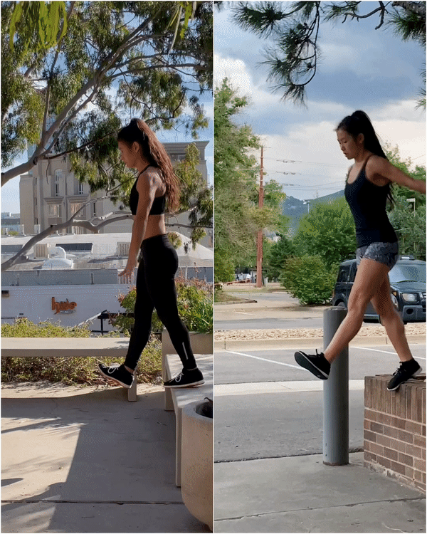 Notice the footwork on each of these jumps, either a right-foot, left-foot approach to a 2-foot Jump or it’s L, R, Jump. Practice this on your approach 2-foot box jumps.