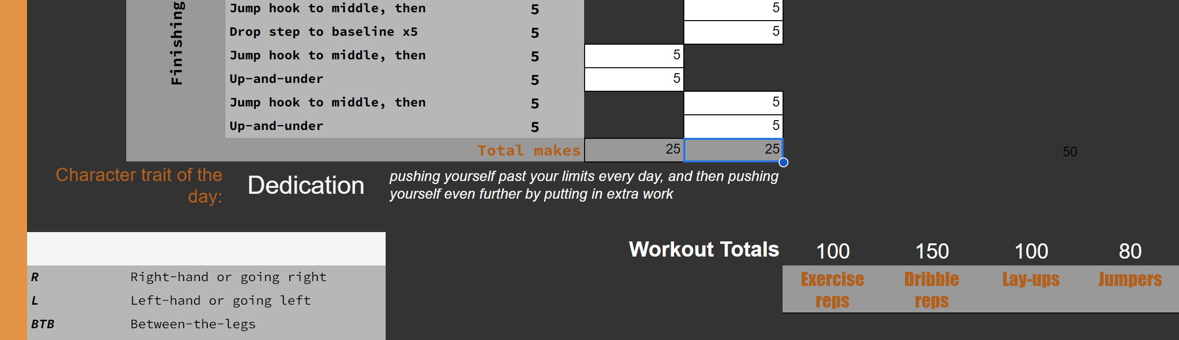 These google sheets will allow you to track your entire workout, automatically calculating your dribbles reps, finishes, and jumpers.
